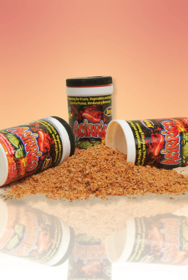 Jovy Acirrico Fire. Chili powder with lemon. Chile en polvo con limón. Seasoning for fruits, vegetables, and snacks.
